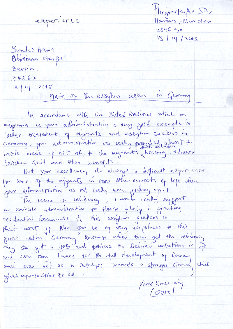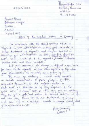 Beim Thema Aufenthalt würde ich Ihrer liebenswürdigen Regierung ans Herz legen, den Asylsuchenden bitte Aufenthaltsdokumente zu gewähren, damit sie sich in dieser großartigen Nation Deutschland nützlich einbringen können. Denn wenn sie den Aufenthalt bekommen, können sie einen Job finden und ihre eigenen Ziele erreichen und sogar Steuern zahlen und damit der Weiterentwicklung des Landes helfen. Sie können sogar als eine Art Beschleuniger für ein stärkeres Deutschland wirken, welches allen mehr Möglichkeiten eröffnet.