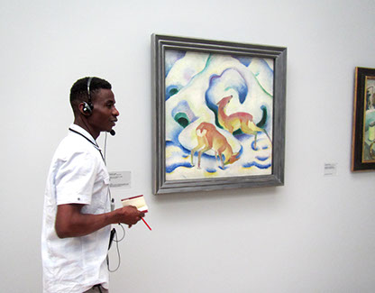 Auf diesem Bild sehe ich zwei Tiere im Schnee. Edward informiert über das Bild und den Künstler. Der Künstler heißt Franz Marc. Er ist in München geboren und hat mit seiner Frau am Kochelsee gelebt. Der Künstler gehört zur Gruppe „Blauer Reiter“. Unser Besuch im Lenbachhaus war interessant und lustig. Viele Grüße Abdoulie und Edward